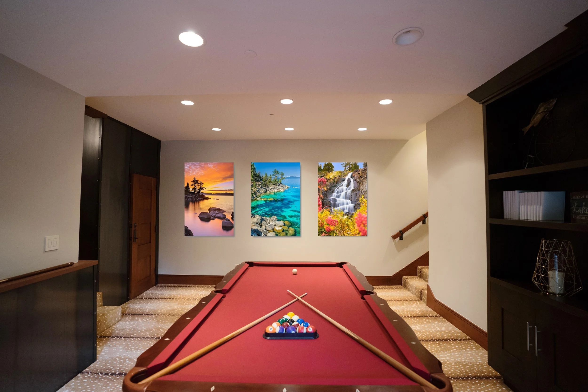 By using hues that enhance your room’s color scheme you can turn your home into a work of art in it’s own right. Complementary colors are those that are opposite to each other on the color wheel. For example, aqua blue is the opposite of orange. For one of my clients , whose room appears below, we chose two orange tone images to mirror the color of the pool table , and then put an aqua blue in between. When the opposites are juxtaposed they cause adjoining colors to appear more rich and vibrant. Without this juxtaposition the room would not appear nearly as interesting or vivid.